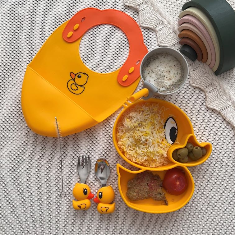 🐣 دستههای قاشق وچنگال حالت سلیکونی و باکیفیته و سر چنگالش حتی گرد کار شده که به بچه آسیب نرسه